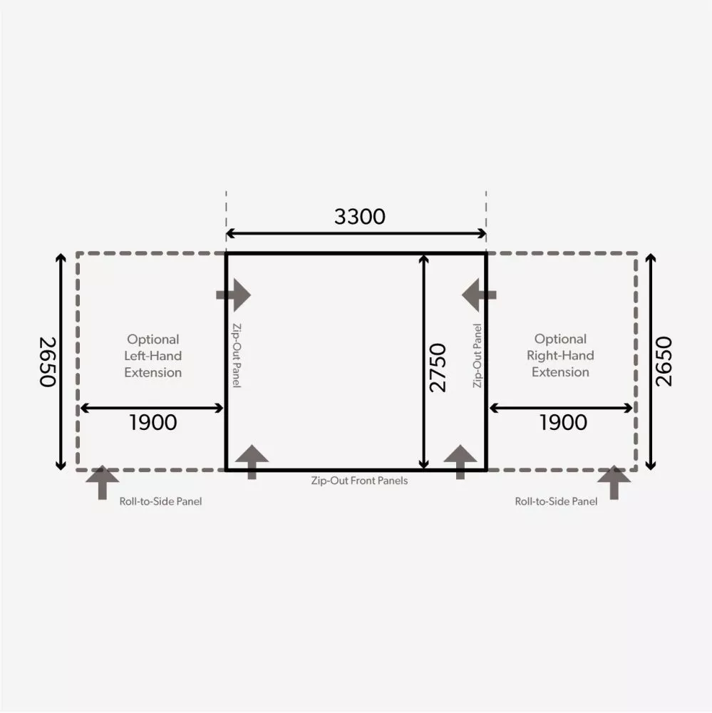 optional erhältliches Front-Vordach, Side Wing und Vorzelterweiterungen