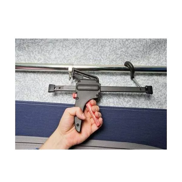 - der Haken klemmt am Rohr und mit dem Rastmechanismus lässt sich der Gestängestab mit dem gewünschten Druck spannen