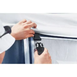 Dieses extrem robuste Abspannband sichert dein Zelt oder Vorzelt bei starkem Wind. Das innovative Sturmband wird an den Seiten der Vorderwand eingeclipst, ohne das seitliche Vordachgestänge zu belasten. Einfacher und effektiver kann eine innovative Abspannung nicht mehr sein. Durch den Einsatz zusätzlicher Spiralfedern, wird die Zugbelastung auf Gurt und Zelt deutlich gedämpft. Eine lohnende Investition in die Sicherheit deines Zeltes.