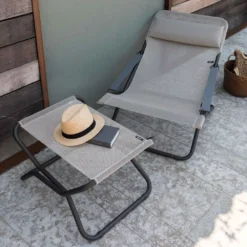 Er lässt sich in 3 verschiedenen Positionen verstellen, inklusive der Liegefunktion zum „Sonnenbaden“. Festgestellt wird die Position mit einem widerstandsfähigen Karabinerhakensystem. Die Armlehnen aus verstärktem Gewebe und die Bodenschoner sorgen für zusätzlichen Komfort. Der Lafuma Transabed hat zudem ein verstellbares und abnehmbares Kopfpolster und braucht wenig Platz im geklappten Zustand. Der Bezug ist ebenfalls abnehmbar.