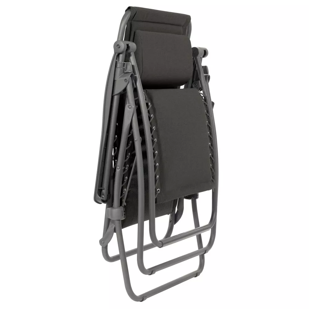 Hervorragenden Komfort liefert die gepolsterte, 3 cm dicke Sitzfläche mit einer Füllung aus hochverdichtetem Schaumstoff. Armlehnen aus Harz mit Schaumstoffeinlage bieten zusätzliche Bequemlichkeit in der gewünschten, stufenlos einstellbaren Sitz- oder Liegeposition. Die Einstellung „Schwerelosigkeit“ (mit den Füssen leicht oberhalb des Herzens) schenkt eine ausgezeichnete Entspannungsposition. Fixiert wird die gewählte Position einfach und sicher mit einer Feststellbremse. Das Gerüst des Camping-Relaxstuhl RSX von Lafuma bildet ein solides HLE-Stahlrohrgestell mit hoher Elastizitätsgrenze. Der attraktive Bezug aus einem angenehmen Baumwollmischgewebe ist abnehmbar und mit einer Aufhängung an austauschbaren Gummischnüren für beste Federung ausgestattet. Ein verstellbares und abnehmbares Nackenkissen unterstützt die rückenfreundliche Ausführung des Relaxsessels.