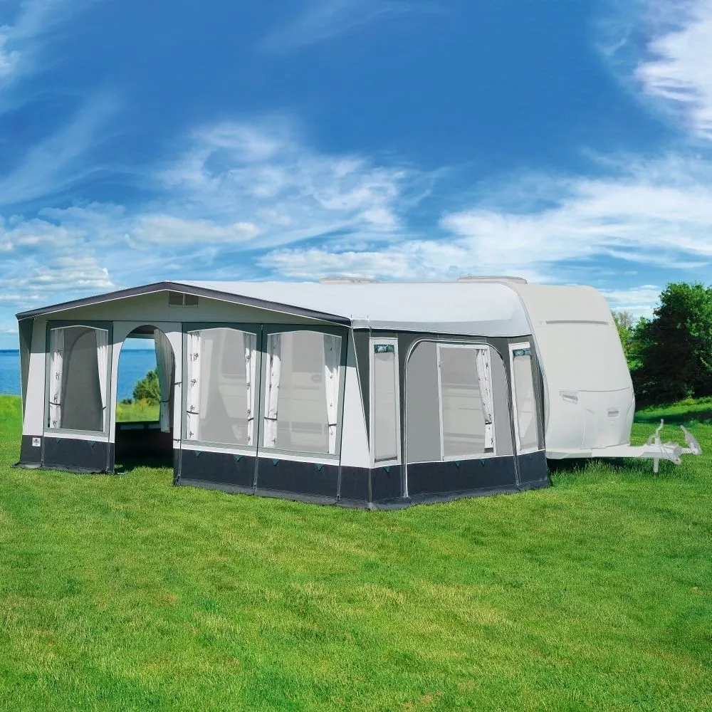 Dieses Caravanvorzelt ist bei Bedarf optional mit einem Vorzelt-Sonnendach erweiterbar. Damit schaffst du dir einen Schattenplatz und kannst deine Sitzgruppe ins Freie verlagern. Oder du benötigst weitere SchlafplÀtze oder Stauraum? Dann ist der als Zubehör erhÀltliche Erker bzw. Seitenanbau die Lösung.