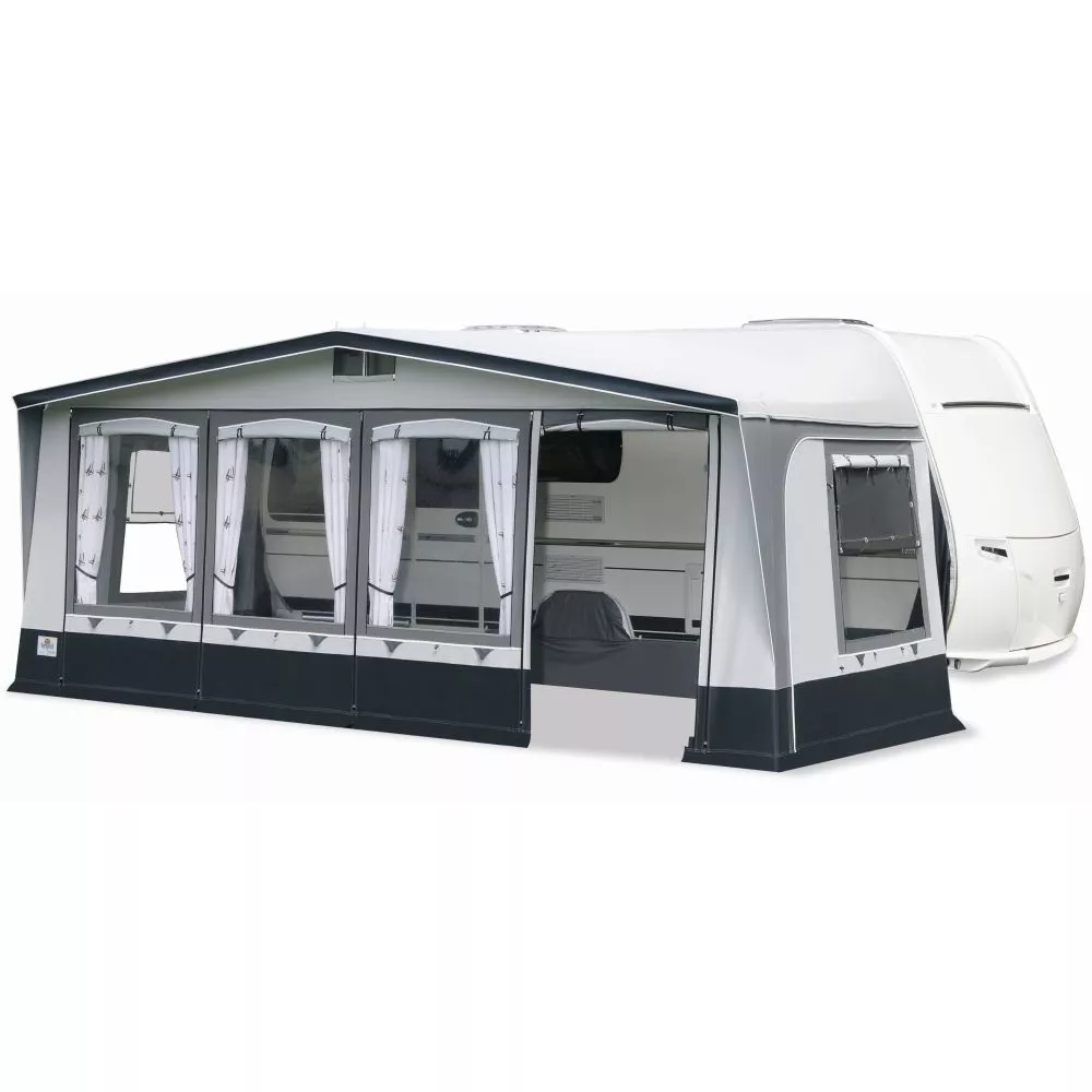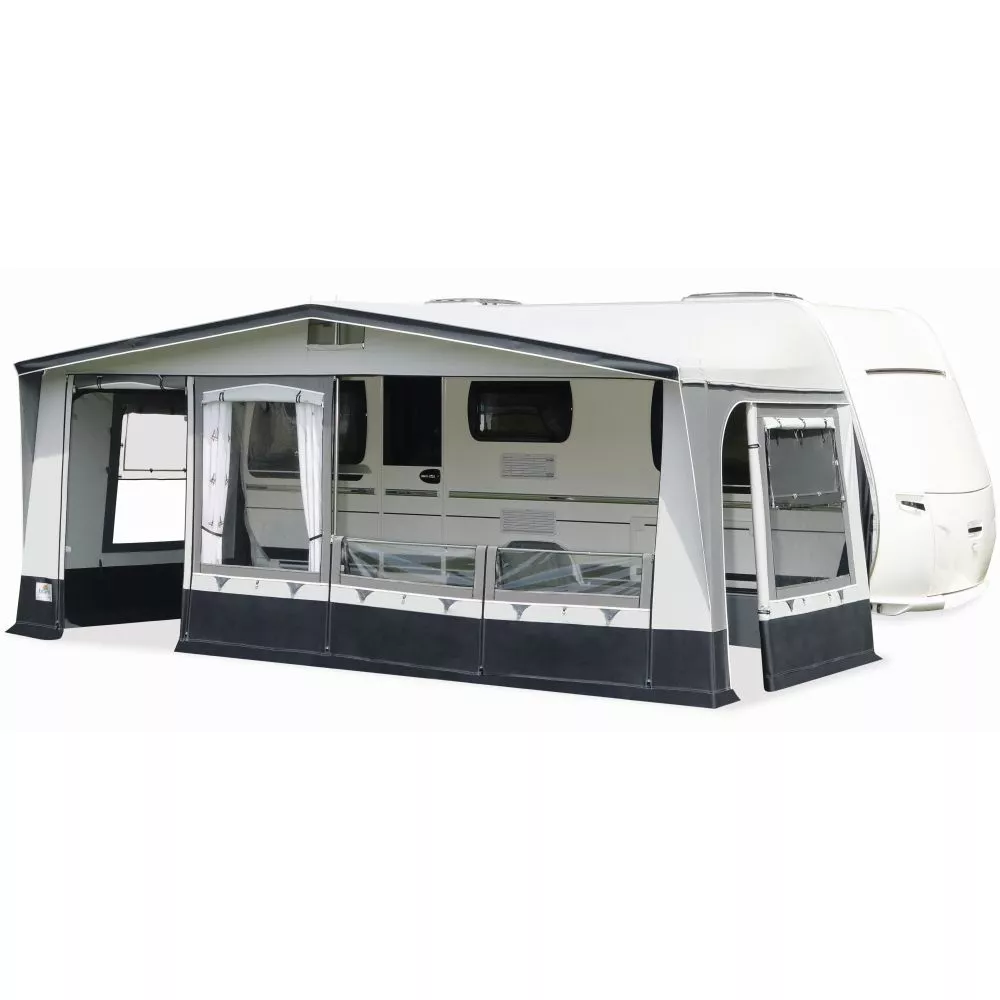 In der Gestaltung bist du sehr flexibel: Durch die Element-Technik der Front, kannst du die TĂŒrposition frei wĂ€hlen. Der beliebte Veranda-Effekt ist mit zusĂ€tzlichen Balkonstangen ebenfalls möglich. Benötigst du nur ein luftiges, Schatten spendendes Wohnwagen-Sonnendach, entfernst du einfach alle Front- und Seitenwand-Elemente.