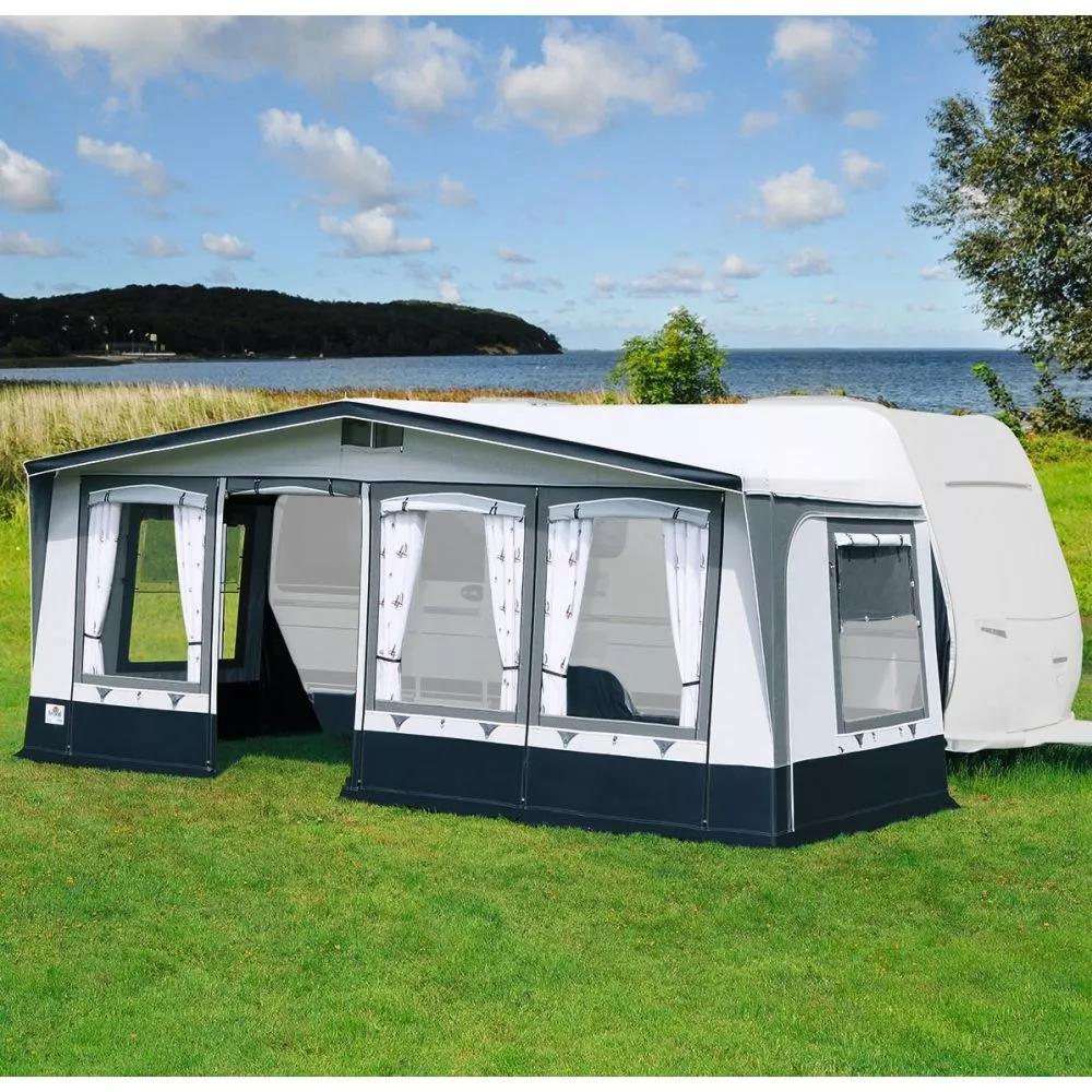 In der Gestaltung bist du sehr flexibel: Durch die Element-Technik der Front, kannst du die TĂŒrposition frei wĂ€hlen. Der beliebte Veranda-Effekt ist mit zusĂ€tzlichen Balkonstangen ebenfalls möglich. Benötigst du nur ein luftiges, Schatten spendendes Wohnwagen-Sonnendach, entfernst du einfach alle Front- und Seitenwand-Elemente.